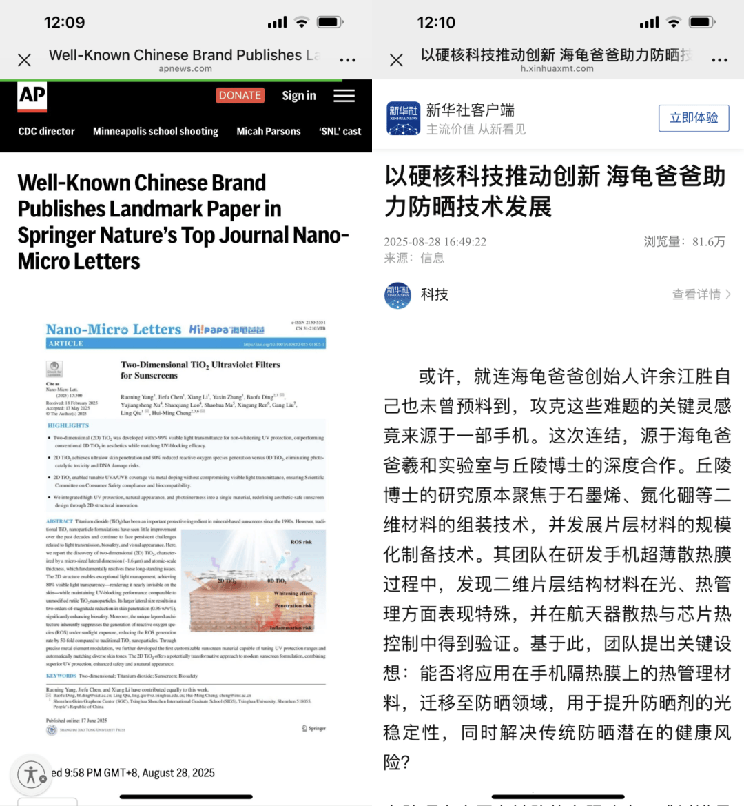 《报告》还重点展示分析了海龟爸爸的多种技术创新应用成果,及全生命周期质量管理体系。海龟爸爸研发的新型二维片层二氧化钛技术,荣登影响因子达36.3的国际材料学顶刊《Nano-Micro Letters》,被审稿人评价为“重新定义防晒设计”的重大进展,这一颠覆性成果,将造手机领域的材料结构改性技术,首次跨界应用于防晒剂研发,从根本上解决了纳米颗粒透皮渗透隐患与传统物理防晒“假白”痛点,被誉为“中国隐形防晒超膜”;仿生疏水膜技术,成功模拟皮肤表面脂质结构(脂质比例 3:1:1),有效提升产品的耐水耐汗性能;在质量管理体系方面,将药品风险管理模式引入化妆品生产,通过定义产品、包材、原料生产过程中的关键环境参数、关键质量风险点、关键质量属性等,建立了一套远超国标的企业内控标准。